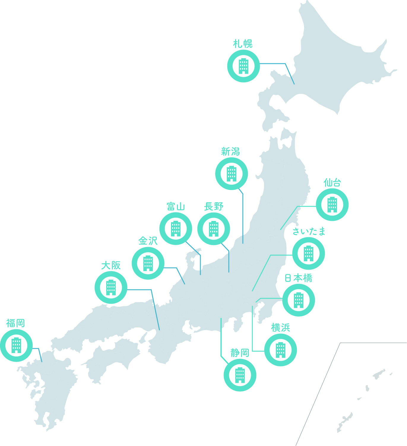 かなで監査法人は、東京都中央区日本橋のほか、全国各地にオフィスを設けています。様々なエリアに社職員が居住しながら活躍しています。